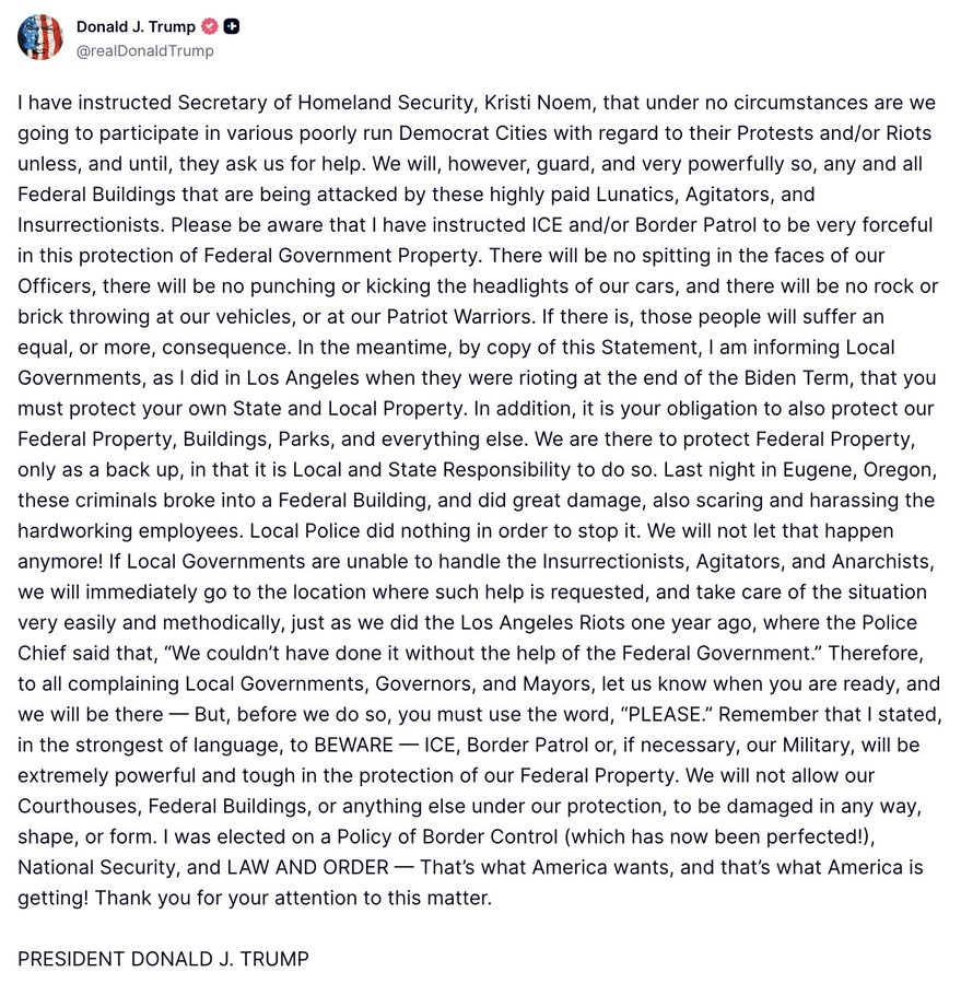 🚨 POTUS: "I have instructed Secretary of Homeland Security, Kristi Noem, that under no circumstances are we going to participate in various poorly run Democrat Cities with regard to their Protests and/or Riots unless, and until, they ask us for help. We will, however, guard, and very powerfully so, any and all Federal Buildings that are being attacked by these highly paid Lunatics, Agitators, and Insurrectionists..."