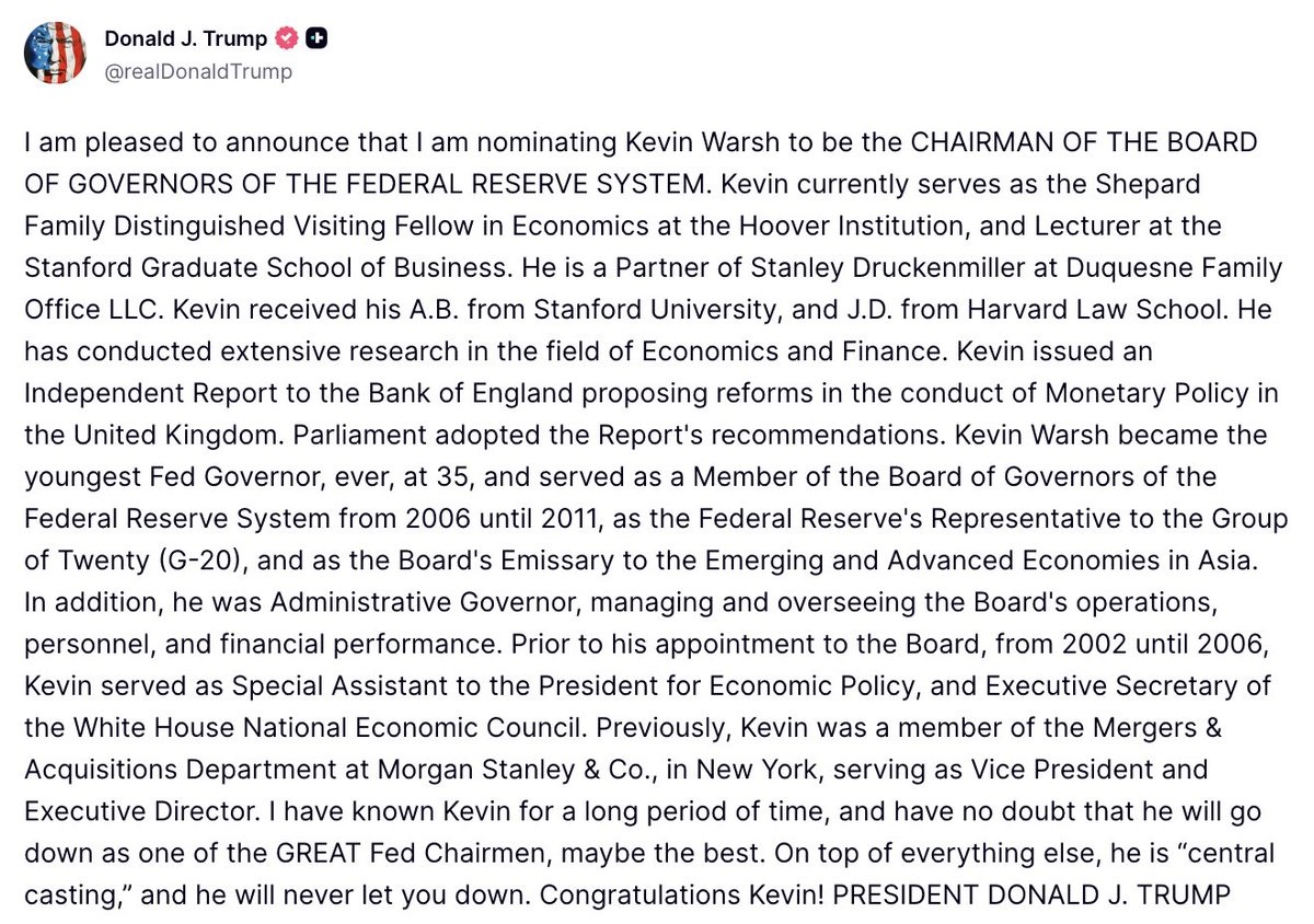 🚨BREAKING: President Trump nominates Kevin Warsh to be the Chairman of the Board of Governors of the Federal Reserve system.