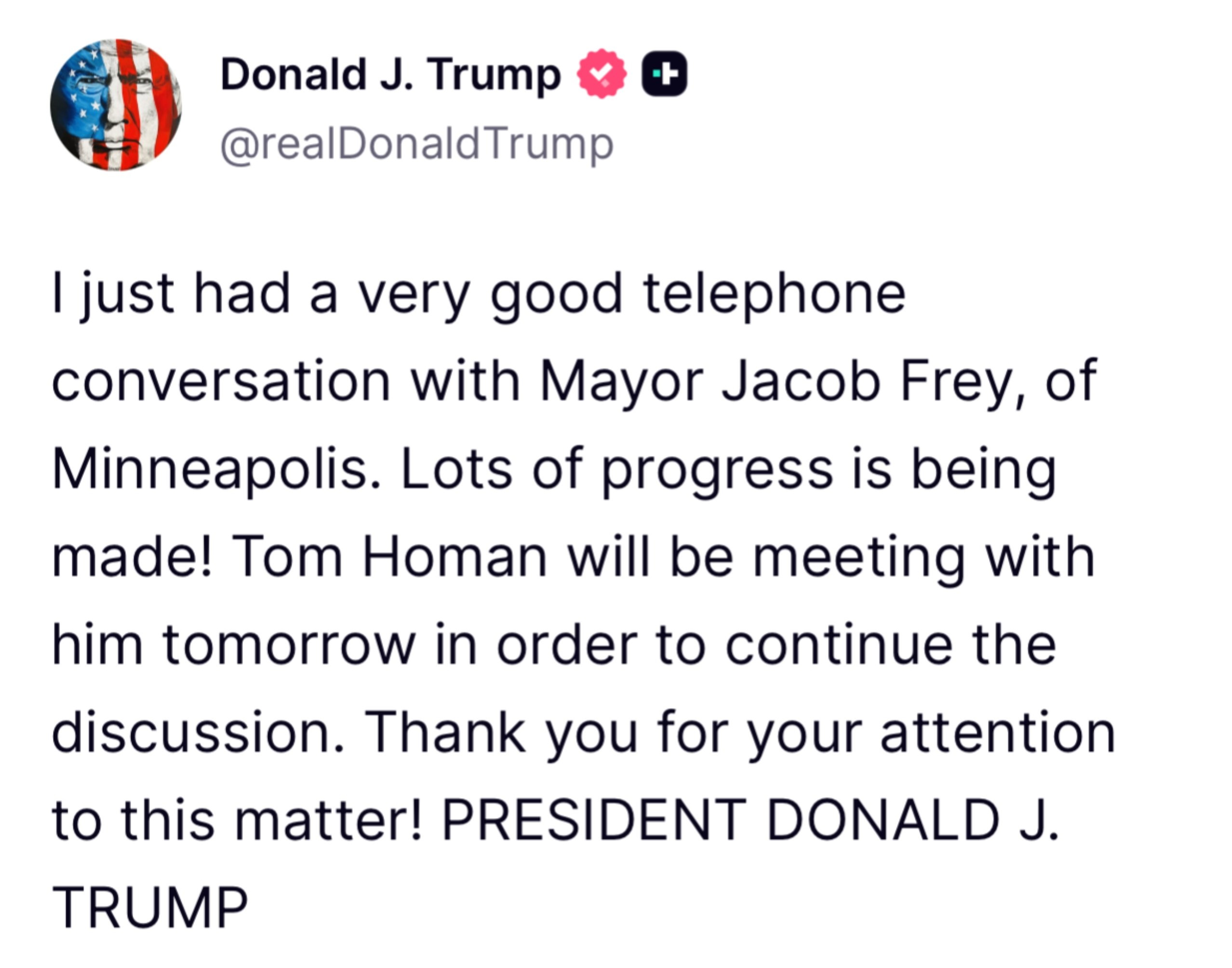 🚨 POTUS: "I just had a very good telephone conversation with Mayor Jacob Frey, of Minneapolis. Lots of progress is being made! Tom Homan will be meeting with him tomorrow in order to continue the discussion. Thank you for your attention to this matter!"