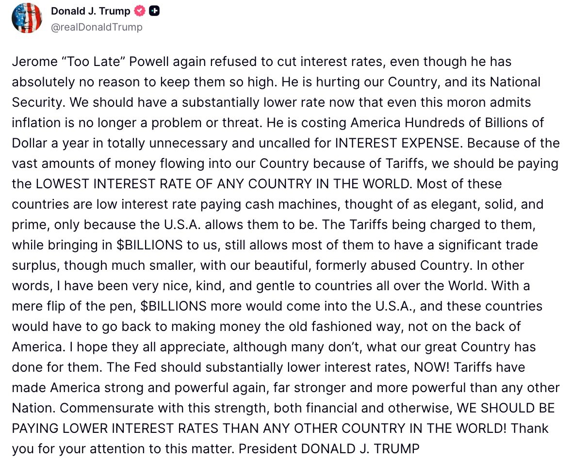 🚨 POTUS: "The Fed should substantially lower interest rates, NOW! Tariffs have made America strong and powerful again, far stronger and more powerful than any other Nation. Commensurate with this strength, both financial and otherwise, WE SHOULD BE PAYING