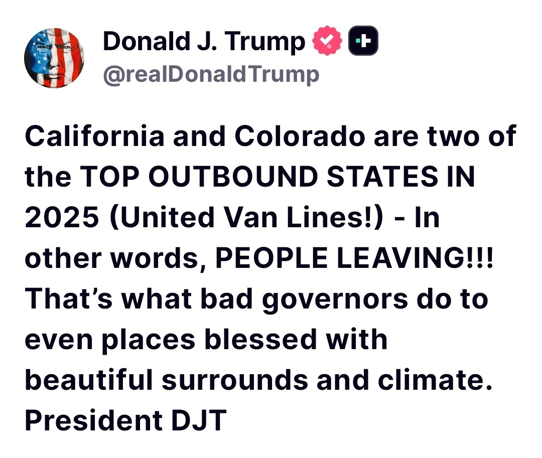 🚨POTUS declares "People are leaving California & Colorado" in droves due to terrible Democrat leadership.