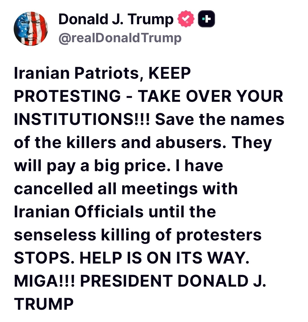 President Trump admonishes the Irianian regime for killing protesters, and encourages Iranian citizens by telling them to "take over their institutions", and that "help is on the way!"