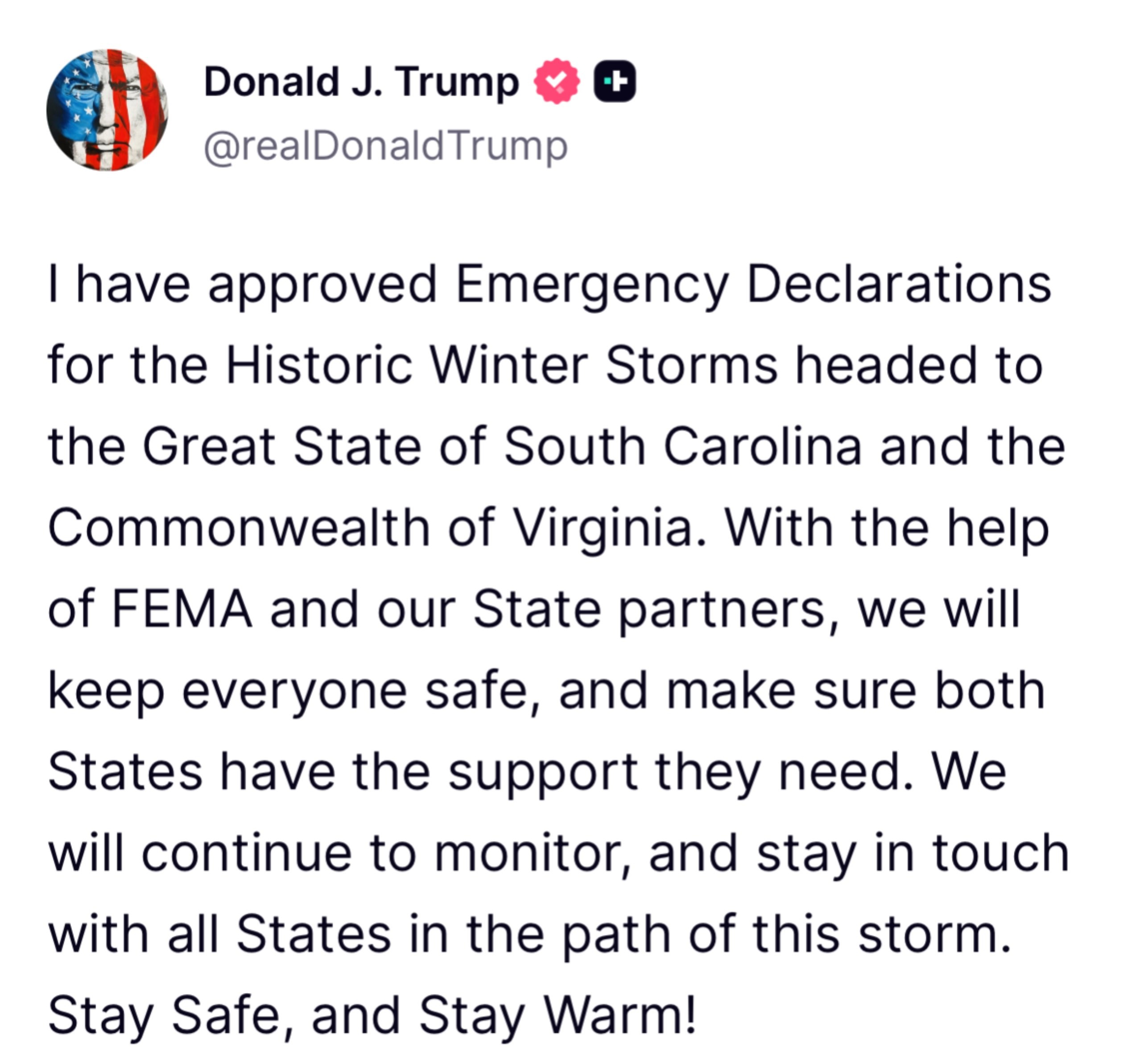 🚨 POTUS: "I have approved Emergency Declarations for the Historic Winter Storms headed to the Great State of South Carolina and the Commonwealth of Virginia."