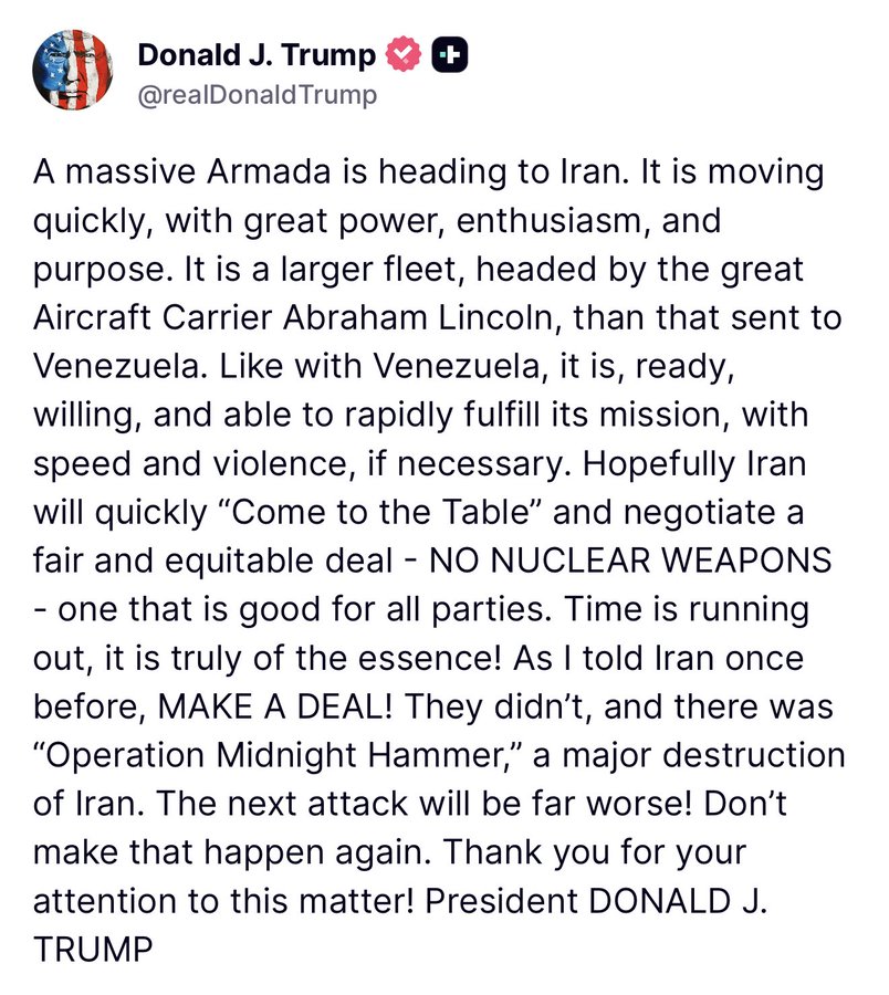 🚨 POTUS: "A massive Armada is heading to Iran. It is moving quickly, with great power, enthusiasm, and purpose. It is a larger fleet, headed by the great Aircraft Carrier Abraham Lincoln, than that sent to Venezuela. Like with Venezuela, it is, ready, willing, and able to rapidly fulfill its mission, with speed and violence, if necessary."